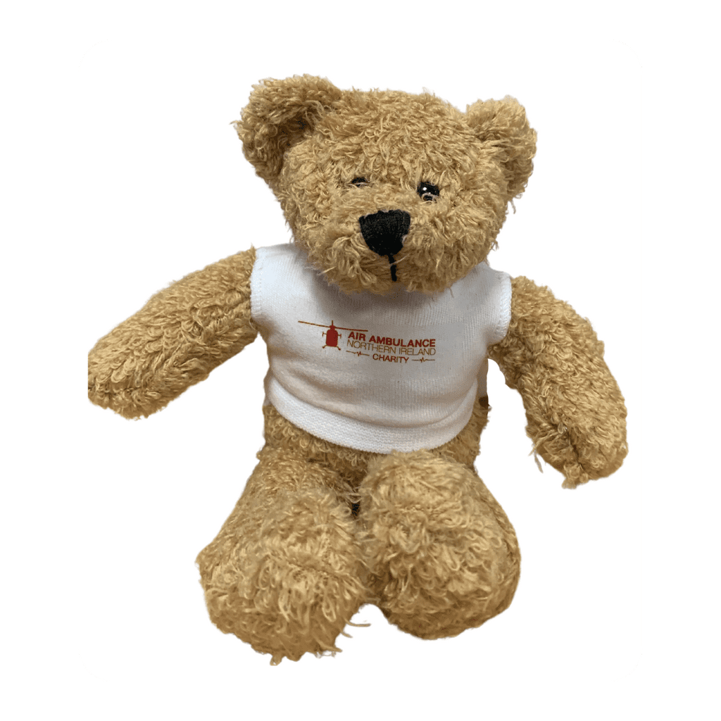 The Air Ambulance bear is a small soft brown bear, with a white Air Ambulance NI t-shirt, this is the perfect gift or keepsake for anyone who loves supporting their local Air Ambulance.